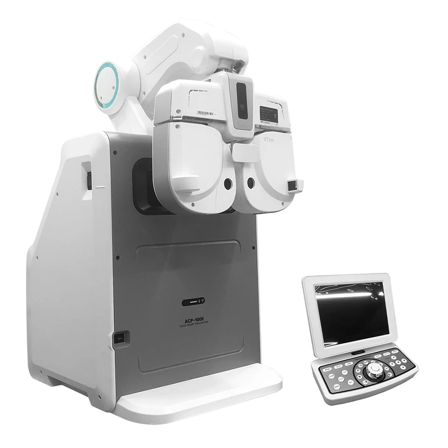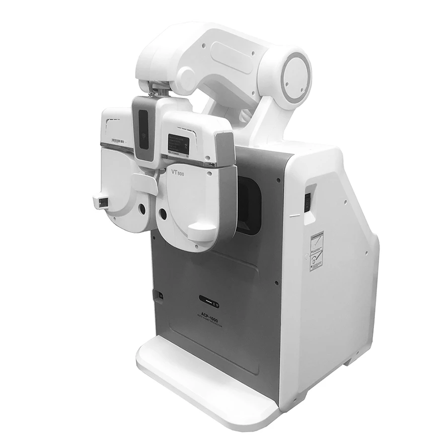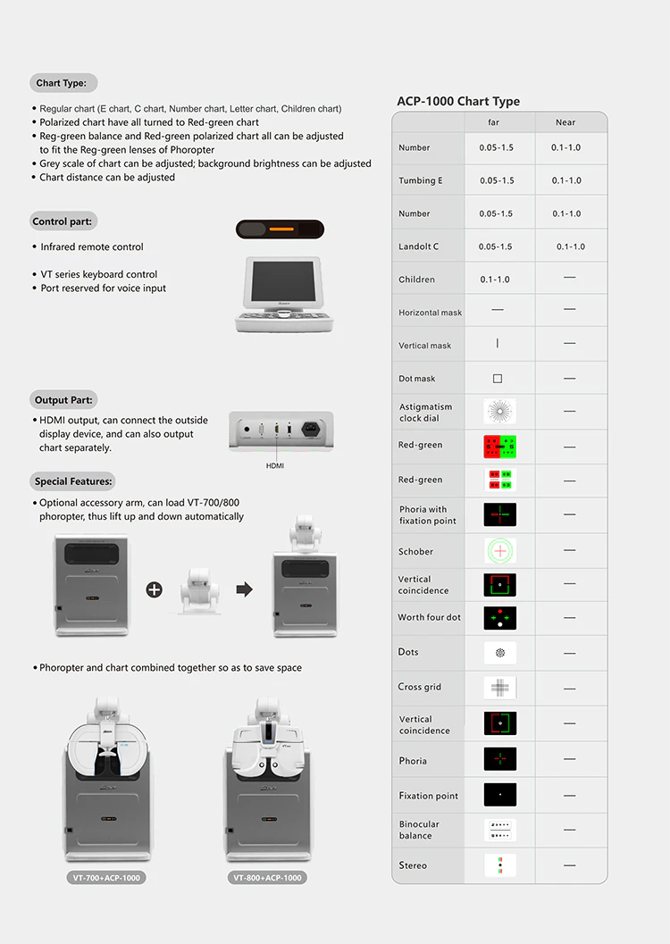 ACP-1000 Auto Chart Projector is an integrated optometry solution that includes the ACP-1000 auto chart projector, ACP arm, and VT800 auto phoropter. It is designed for efficient and accurate visual acuity testing in clinics and optical stores.