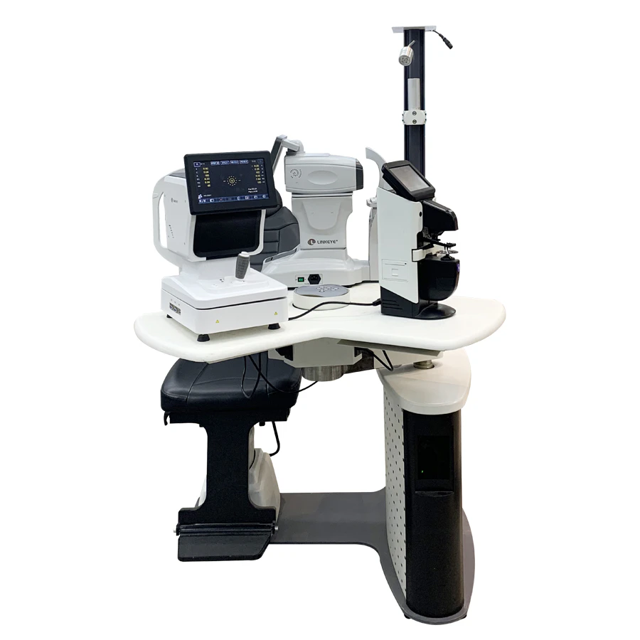 The unit supports installation of three ophthalmic instruments on the table. This setup allows the operator to perform multiple tests without moving the patient, improving workflow efficiency.