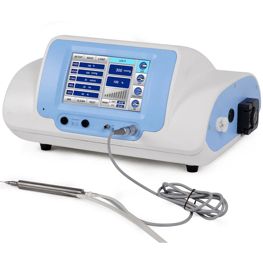 The system includes a large TFT touch screen with user-friendly menus, preset parameters for different surgical needs, and an auto test mode to check tubing and handpiece. Peristaltic pumps provide precise control of aspiration flow and stronger suction in I/A mode. Built-in vitrectomy and cautery functions, along with intelligent voice reminders, enhance safety and efficiency during surgery.