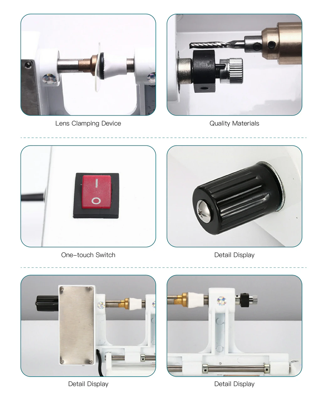 The machine supports three common suction cup types (Takubo, Briot, and Topcon), allowing quick switching between different lens edgers without additional adapters.