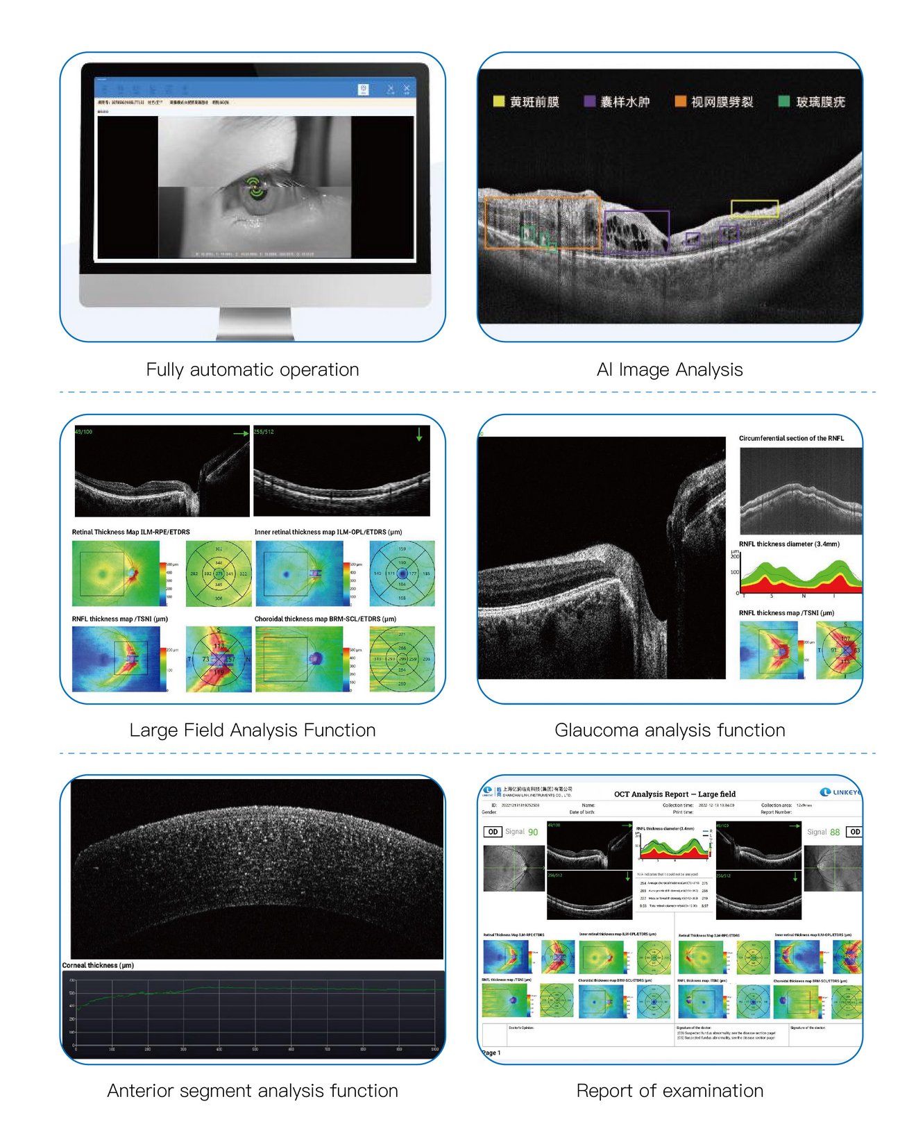 The RetiView 500 OCT machine features accurate analysis software with customized functions for each scan. It segments 10 retina layers and provides binocular comparison, single-eye follow-up, and glaucoma progress analysis for precise clinical diagnosis.