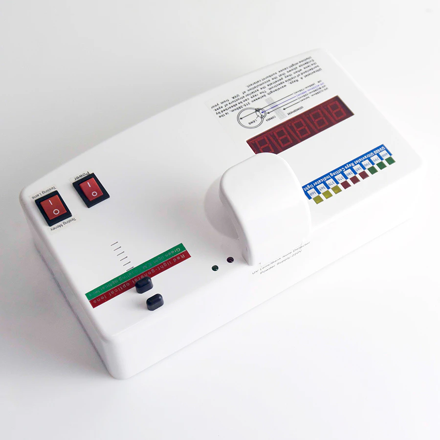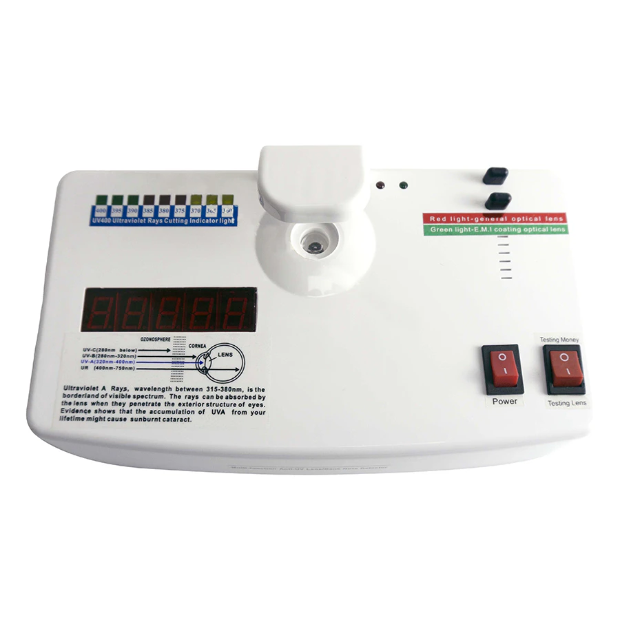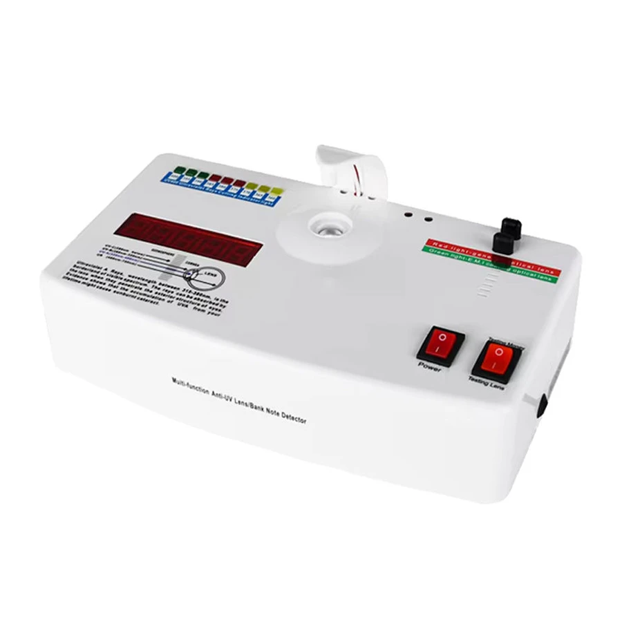 The UV-100 is designed for testing UV-400 lenses, anti-radiation lenses, and verifying the authenticity of currency. It offers a straightforward solution for determining lens protection against UV rays and radiation. The device is compact, easy to use, and provides quick, reliable results.